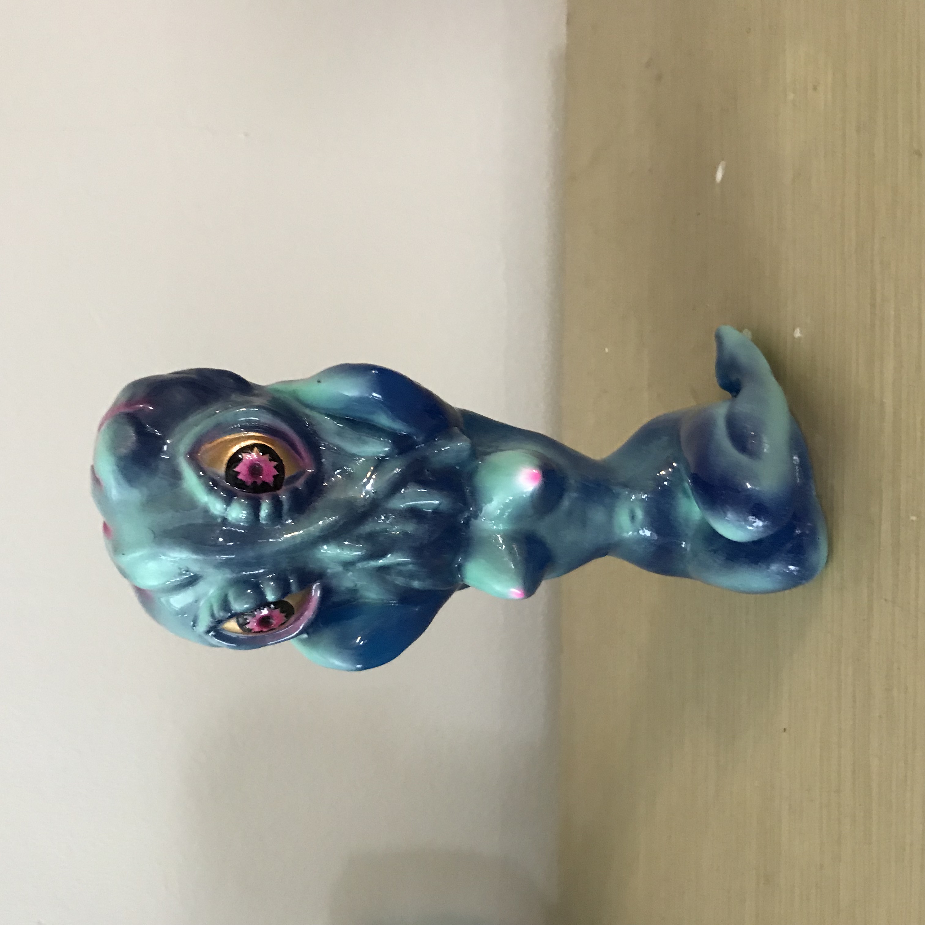 Around 6.5" tall, cast in solid translucent resin, overpainted with Monster Color Paints and a high gloss coat, to prevent these nipples from getting rubbed off by perverts at parties.