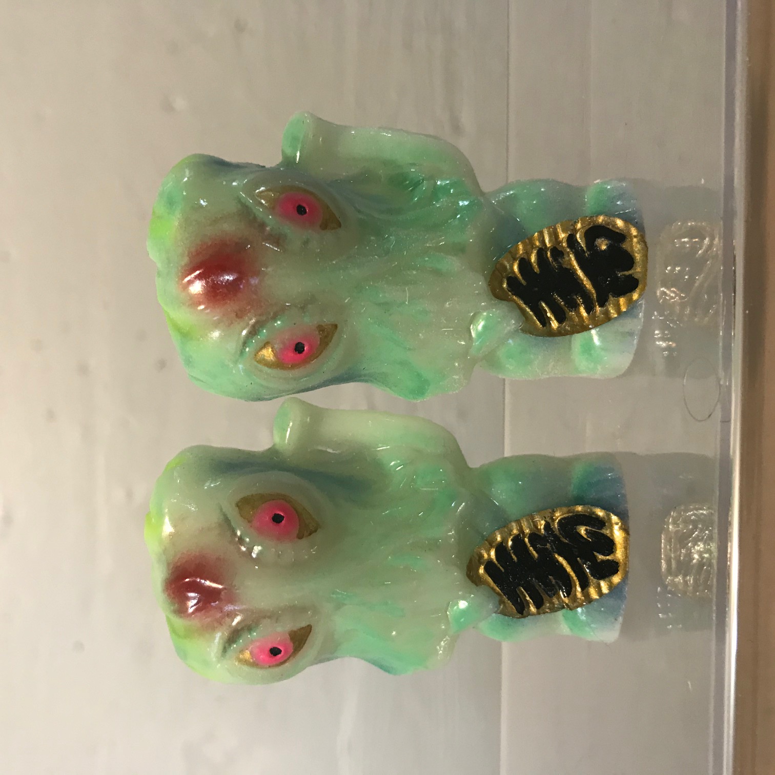 2.5" tall shrunken copy of the original mold. I painted three up in my favorite frosty color way, these are cast with glitter and pearl powder. Bring you good luck from everyones favorite smog monster.