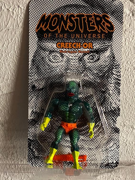 Cree-Chor Black Lagoon Warlord. 2 points of articulation and weapon included. Right to scale with the classic M.O.T.U. figures, this is the toy I dreamed of as a kid, remco meets He-man. Cast in resin painted with Monster Kolor paints with a high gloss clear coat. Hand made packaging, blister made by me graphics mounted on heavy card stock.
