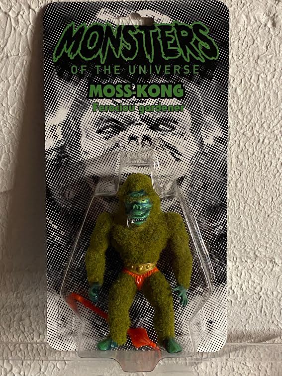 Moss Kong comes flocked in green, but does not smell of pine. 2 points of articulation and weapon included. Right to scale with the classic M.O.T.U. figures Cast in resin painted with Monster Kolor paints with a high gloss clear coat. Hand made packaging, blister made by me graphics mounted on heavy card stock.