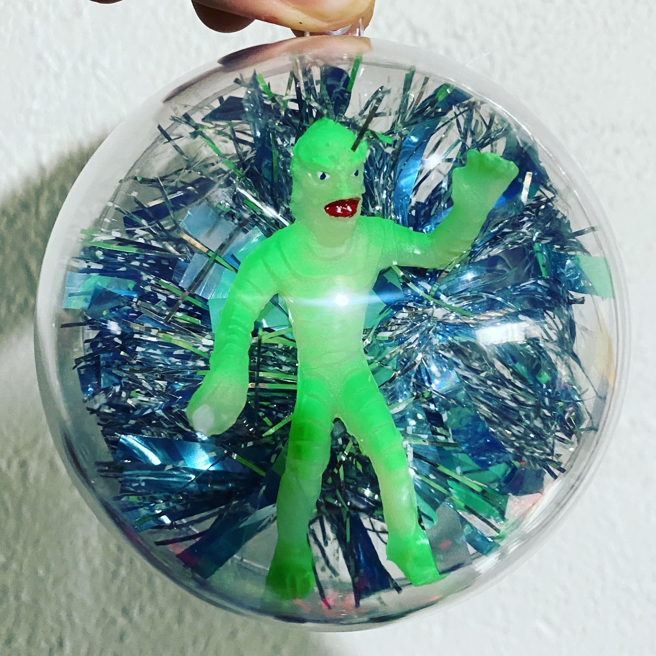 3" glow in the dark creature handpainted and packaged in a festive ornament, these ornaments can be opened to display him separately.