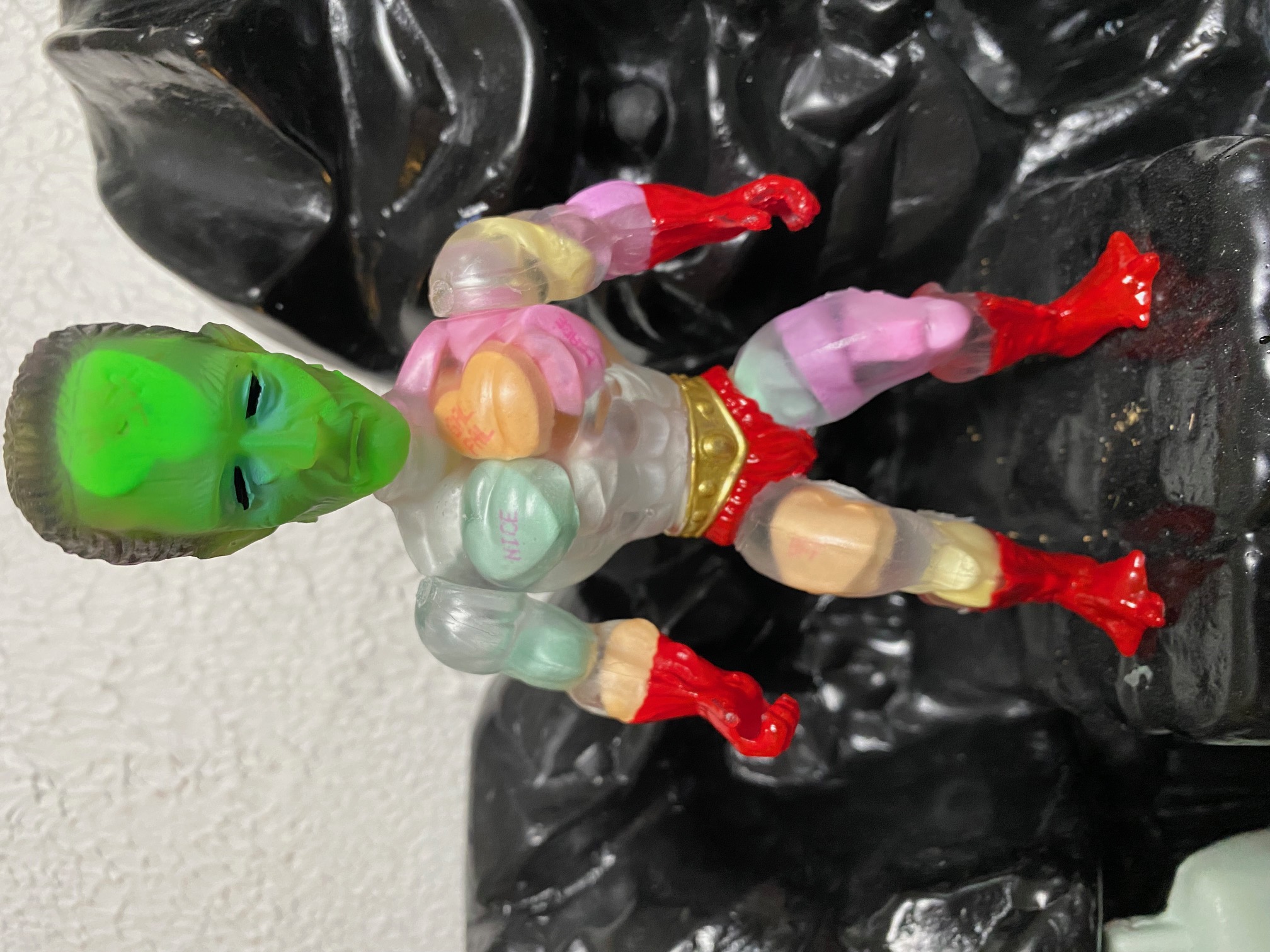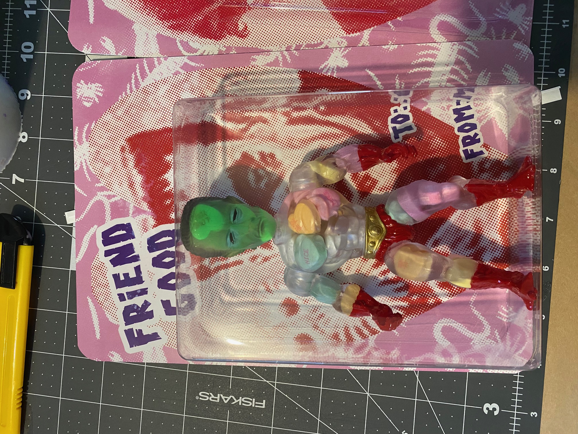 Roughly 6" tall fully articulate bootleg valentine figure. Cast in clear resin and full of candy hearts. Comes in special valentines blister pack. each one is a one off.