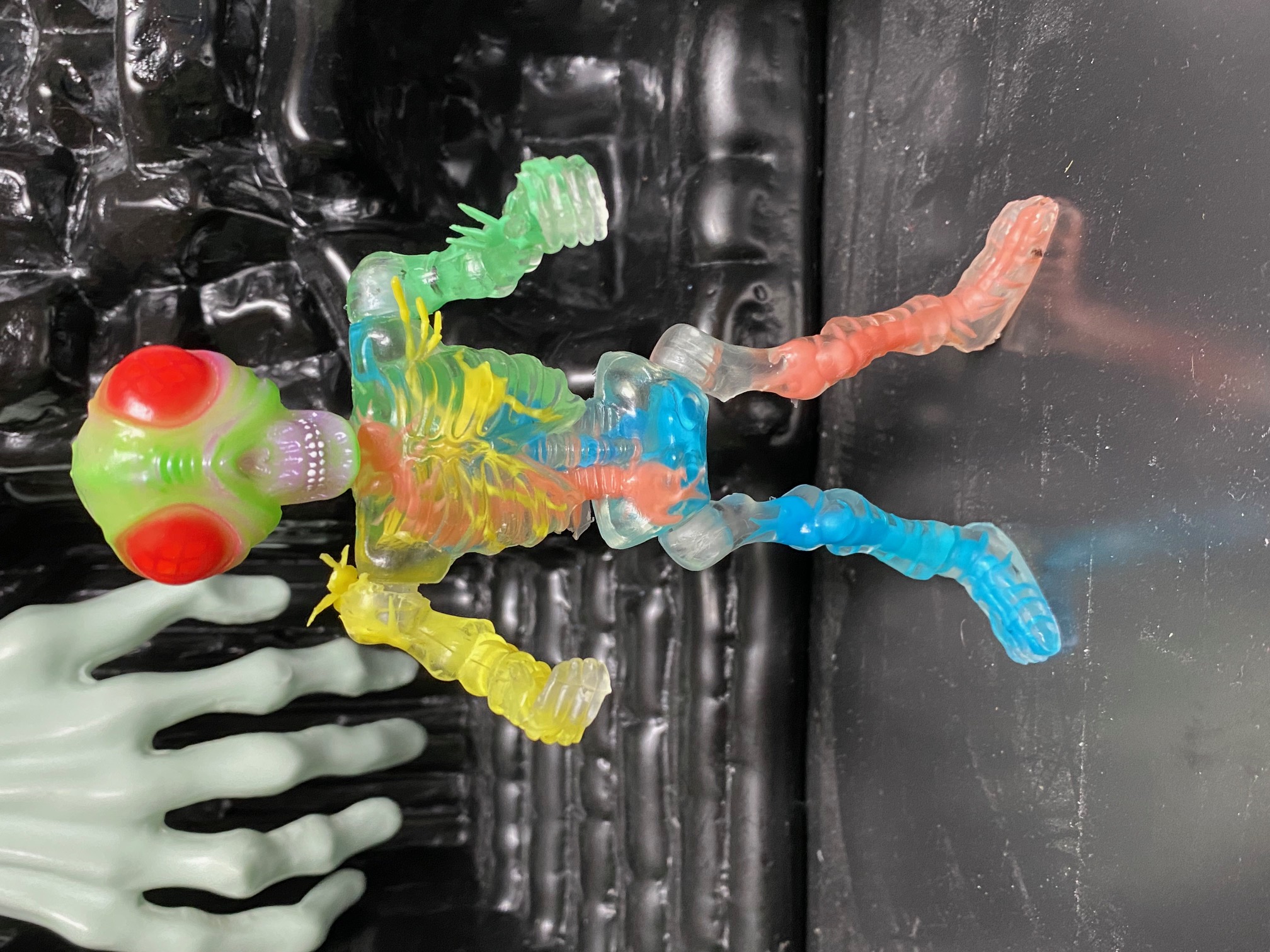 Crystal clear full of vintage creepy crawlies with glow in the dark insect head. About 6" tall, 5 points of articulation. Hand cast and painted, comes on blister card. 1 of 1.