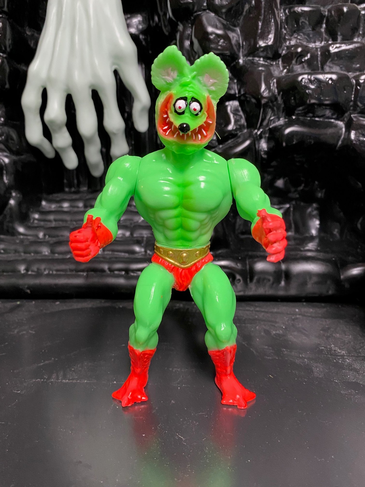 Rat fink with rippling muscles ready to flex.. About 6" tall, 5 points of articulation. Hand cast and painted, comes on blister card. 1 of 1.