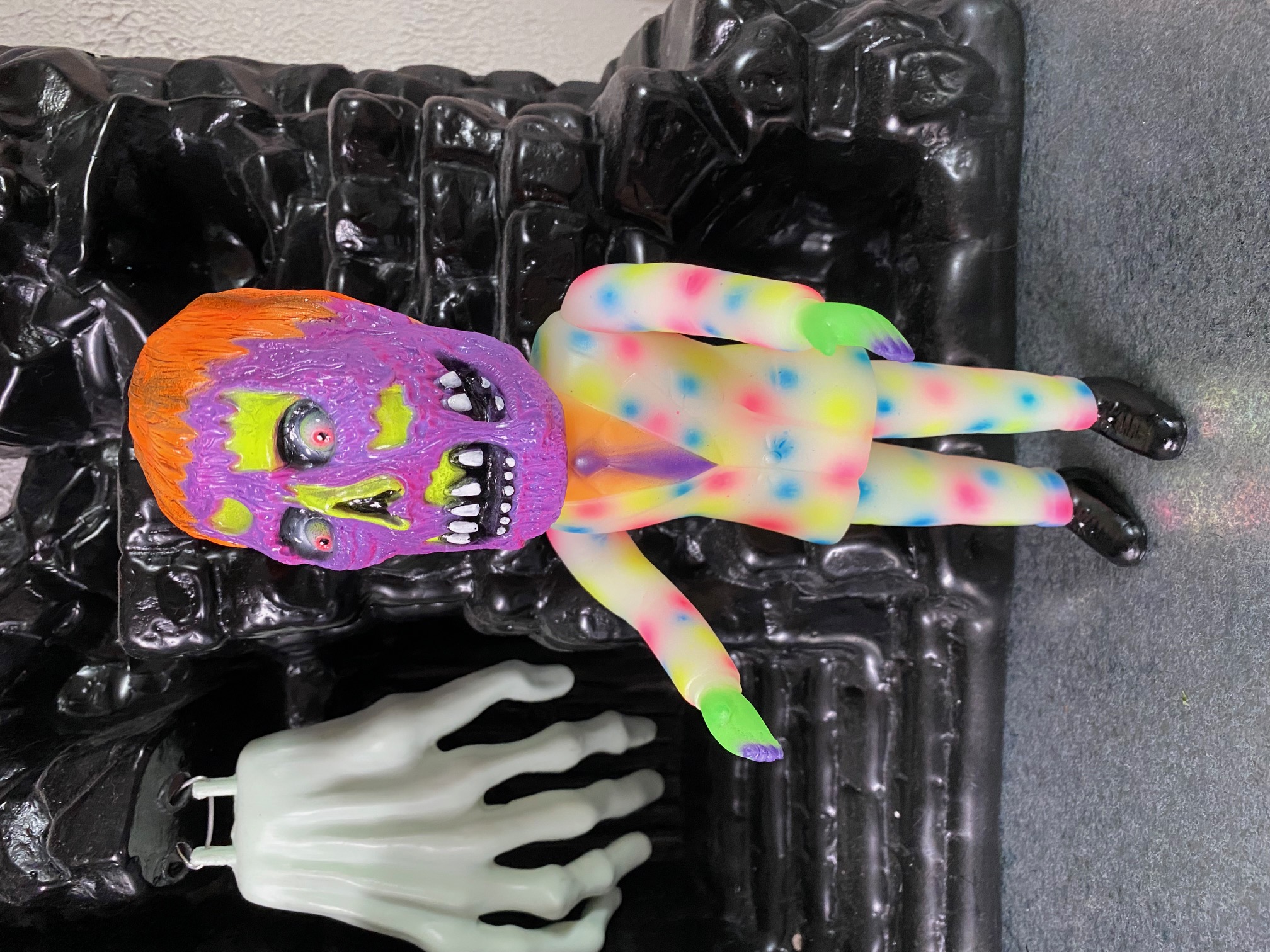 Over 10" tall, Screaming day glow colors from vinyl wonder paints, 3 points of articulation ( arms and head). Cast solid bodies, heavy rotocast heads. These are some big heavy hunks of resin.