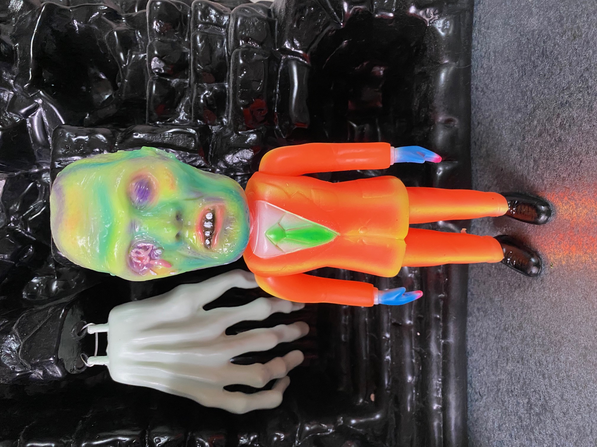 Over 10" tall, Screaming day glow colors from vinyl wonder paints, 3 points of articulation ( arms and head). Cast solid bodies, heavy rotocast heads. These are some big heavy hunks of resin.