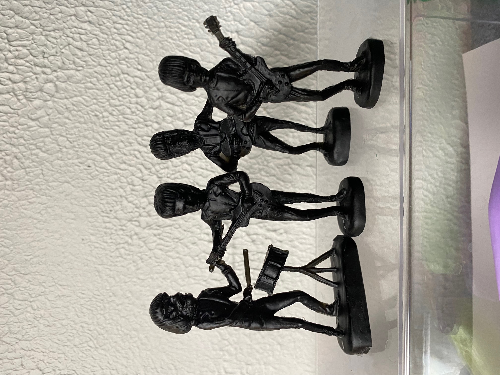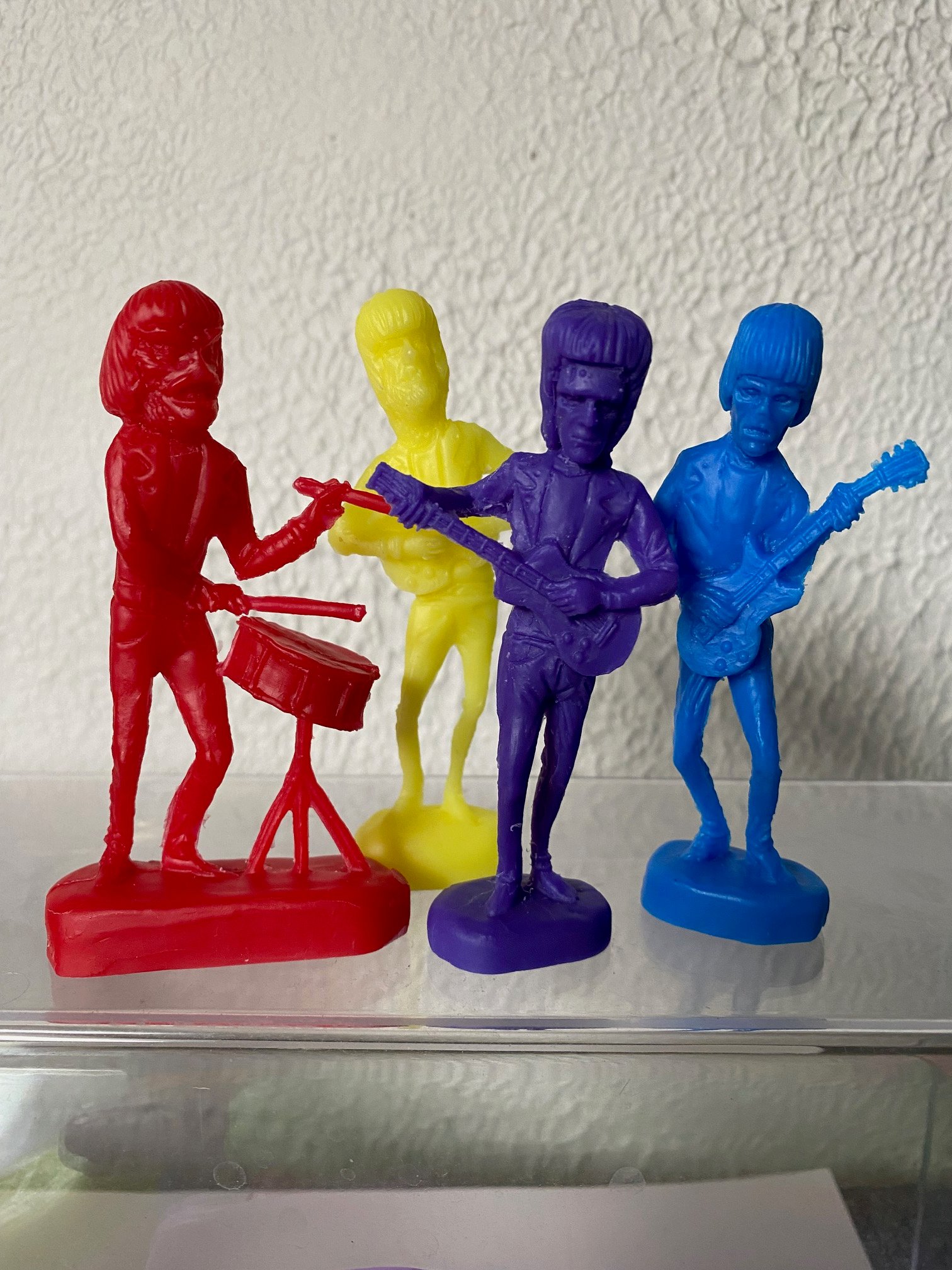 Around 3.5 inches tall, 2 different sets of 4 , one in all black the other mixed colors, comes bagged with header